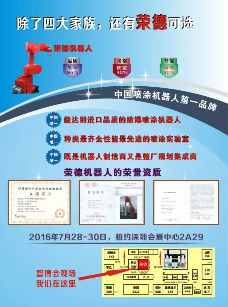 2016深圳國(guó)際智能裝備產(chǎn)業(yè)博覽會(huì)將于7月28日-30日在深圳會(huì)展中心拉開(kāi)大幕,國(guó)產(chǎn)機(jī)器人唯一參展商--榮德機(jī)器人,將與國(guó)際機(jī)器人四大家族--日本安川、日本發(fā)那科、德國(guó)庫(kù)卡、瑞士ABB在二號(hào)館同臺(tái)亮相,榮德機(jī)器人在列強(qiáng)面前敢于亮劍,也熱烈歡迎新老客戶及各位朋友前往參觀指導(dǎo)。