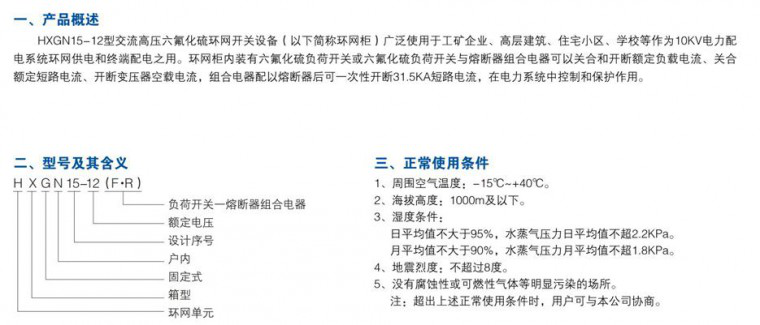 HXGN15-12系列環(huán)網(wǎng)柜適用于城市電網(wǎng)改選和建設(shè)需要的新一代高壓電器產(chǎn)品。內(nèi)部元件均選用國內(nèi)目前先進(jìn)產(chǎn)品。該產(chǎn)品經(jīng)形式試驗(yàn)和長期的運(yùn)行考核,并有滿足二次要求的可靠防誤操作措施。防護(hù)等級(jí)達(dá)到IP2X,且具有體積小,重量輕、操作簡單、操作環(huán)網(wǎng)柜適應(yīng)于廠礦、住宅小區(qū)、高層建筑、學(xué)校、公園等場(chǎng)所的三相額定電壓10kV、額定頻率50Hz的配電系統(tǒng),作為接受和分配電能之用??捎糜诃h(huán)網(wǎng)供電和終端供電,也可裝在箱式變電站中。
