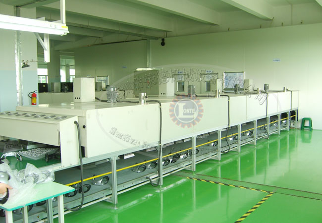 噴漆烘干流水線技術(shù)優(yōu)勢:該裝置反射鏡采用聚光型冷鏡,燈下加裝石英玻璃板,可有效降低被照物表面溫度;變頻無級調(diào)速,保證傳送平穩(wěn);觸摸屏微電腦自動控制,實現(xiàn)人機(jī)對話;每套UV系統(tǒng)獨立控制,依生產(chǎn)開啟燈管數(shù)量;每支燈設(shè)累計工作計時器,方便掌握燈管工作時間和老化程度;透明視窗,工作時可以觀察固化燈工作情況,并設(shè)開門保護(hù)裝置;燈管及燈罩可以上下調(diào)整。